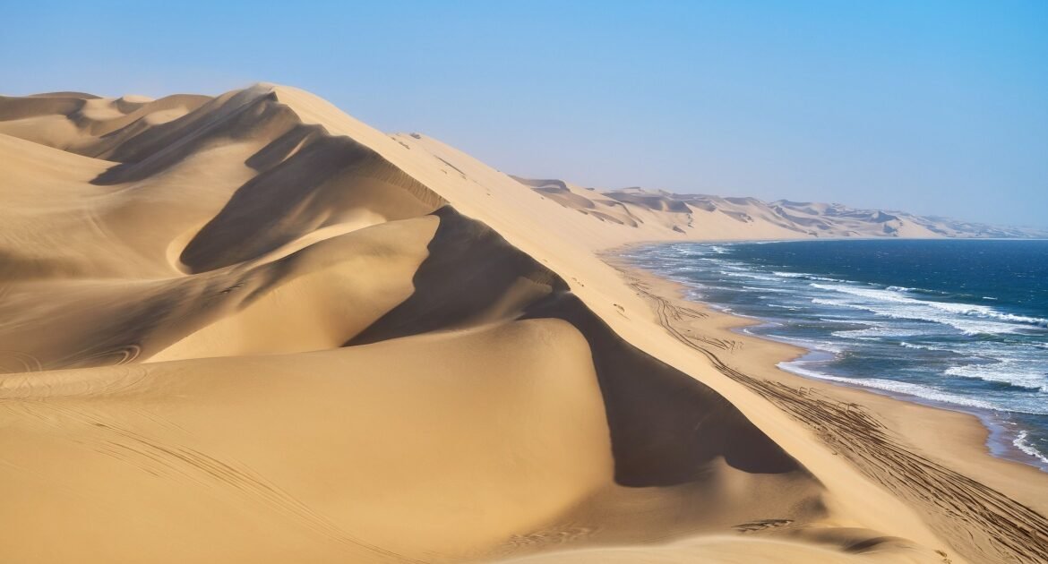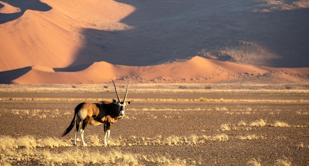 A Namibia safari centers on landscape as much as wildlife, moving through desert valleys, open gravel plains, and remote coastlines where sand meets the Atlantic in striking contrast.